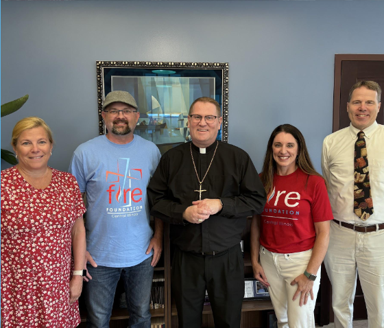 From left to right: Dr. Susie Cicciarelli (Associate Superintendent of Catholic Schools, Catholic Diocese of Peoria), Dr. Jay Percell (Interim Executive Director & Co-Founder), Bishop Louis Tylka, Mrs. Renee Percell (Co-Founder of the FIRE Foundation), and Dr. Jerry Sanderson (Superintendent of Catholic Schools, Catholic Diocese of Peoria)